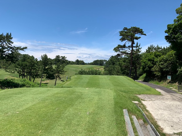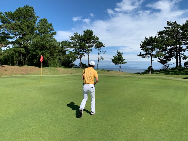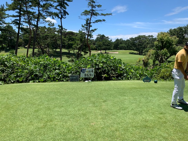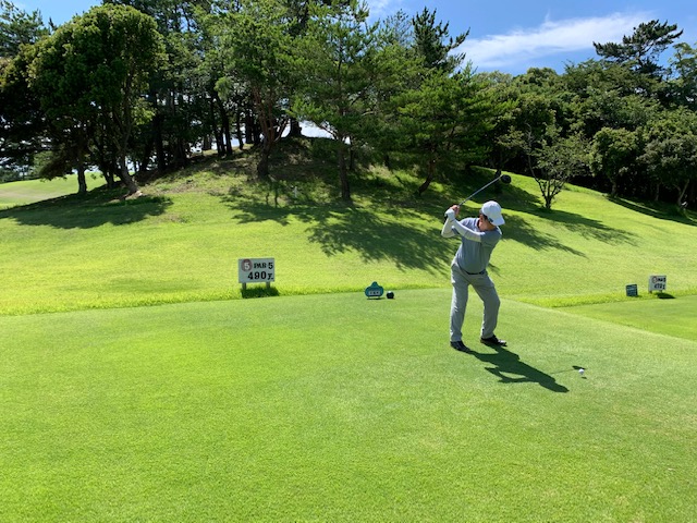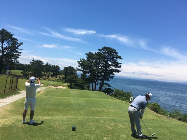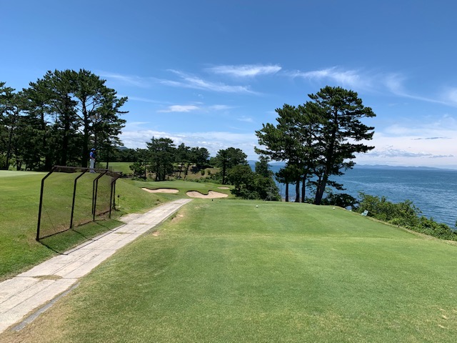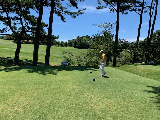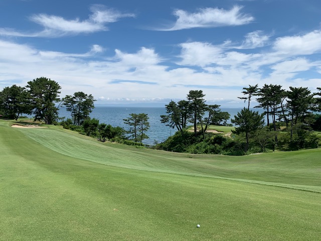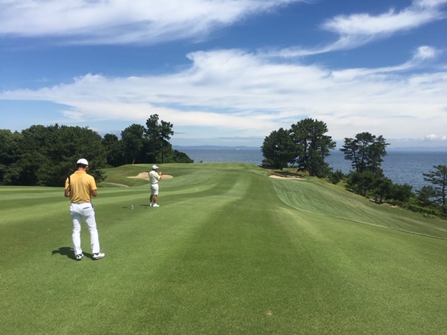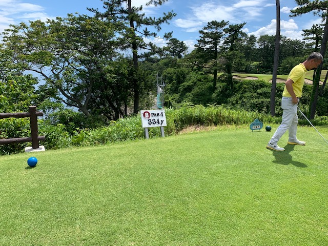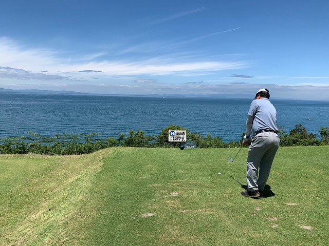 3番435yミドルは、ドライバーはまずまず。が、セカンドの7アイアンがど竜巻球。OB。アホか。打ち直しはショボ。7となる。見事なドライバー&アイアンでJ.Oさんがパー。フェアウェイは狭く、その先には海がドーンと見える豪快・狭いと感じるホールです。