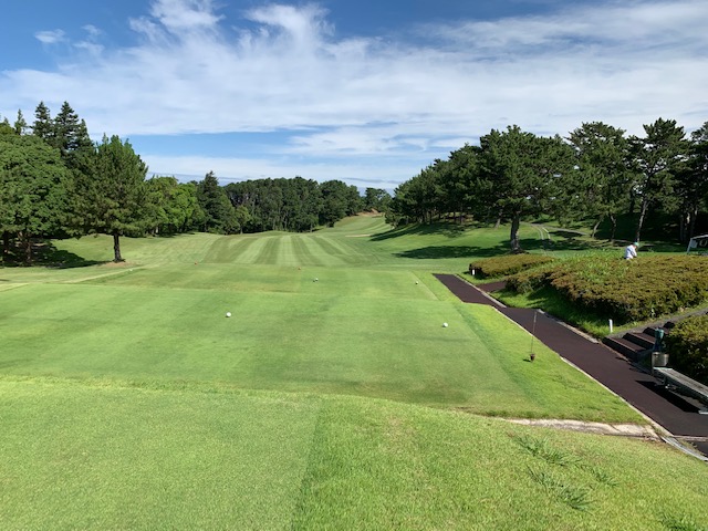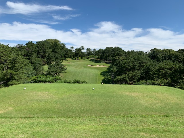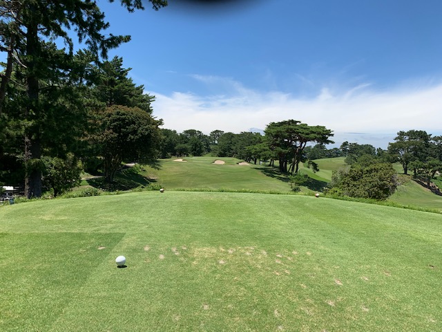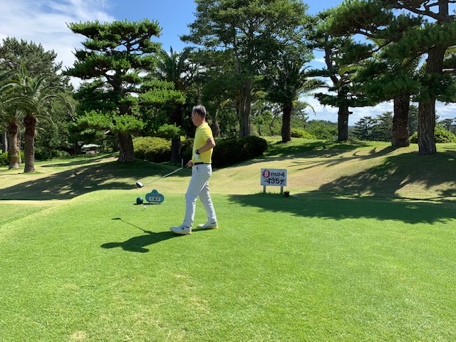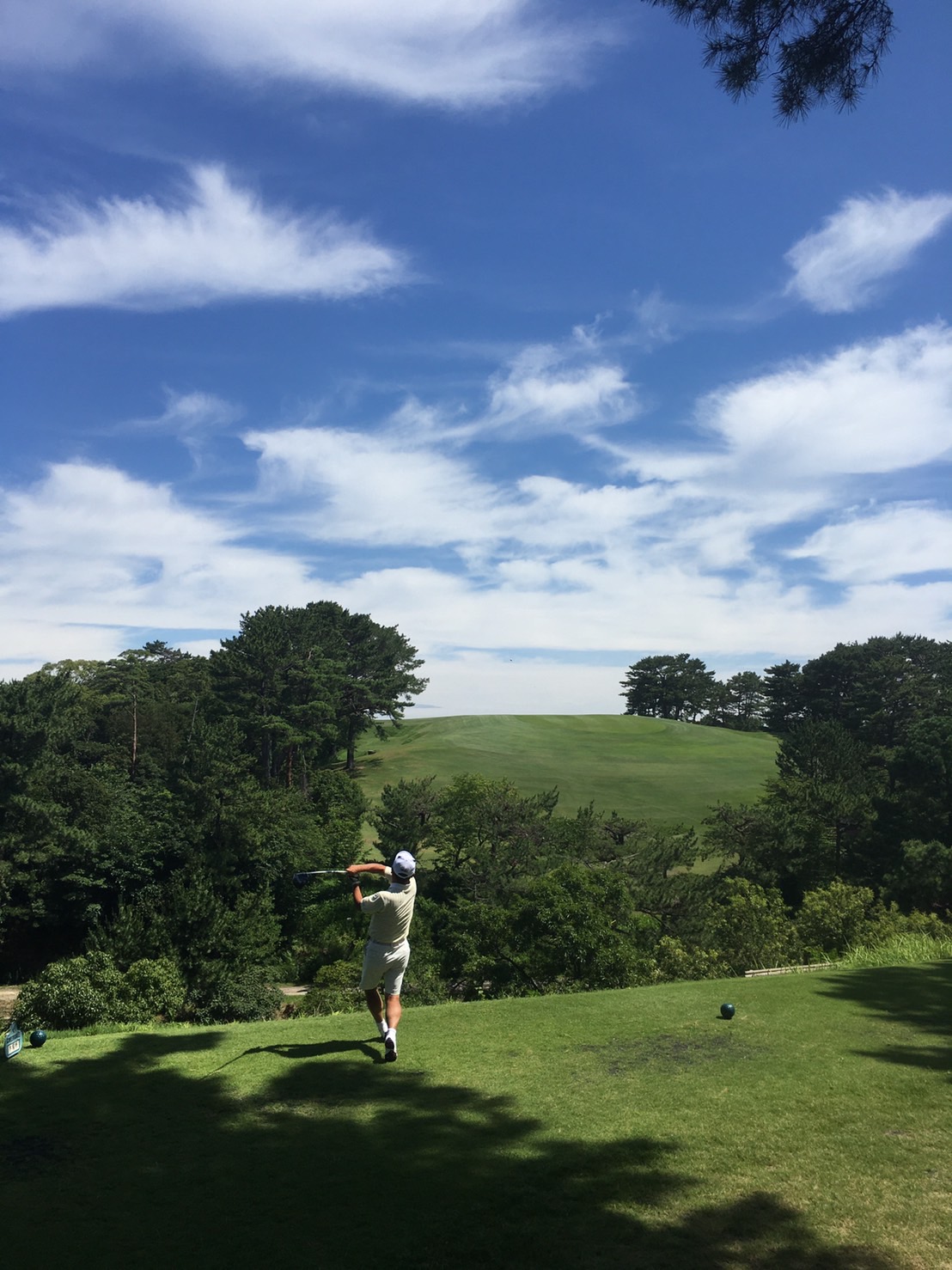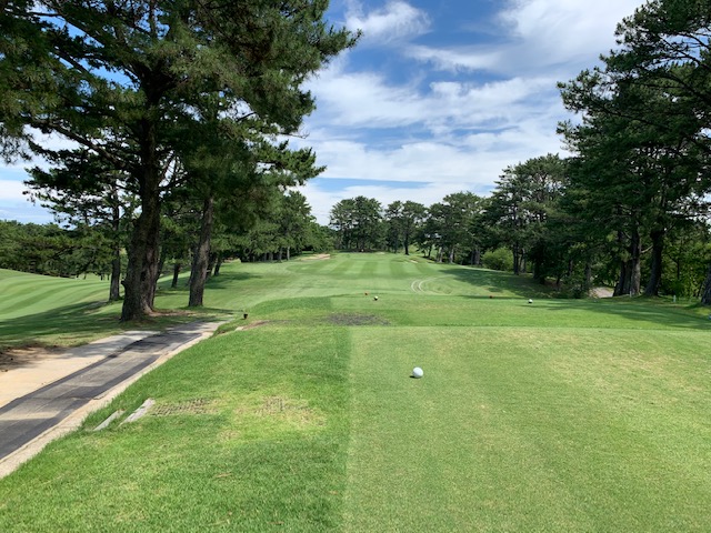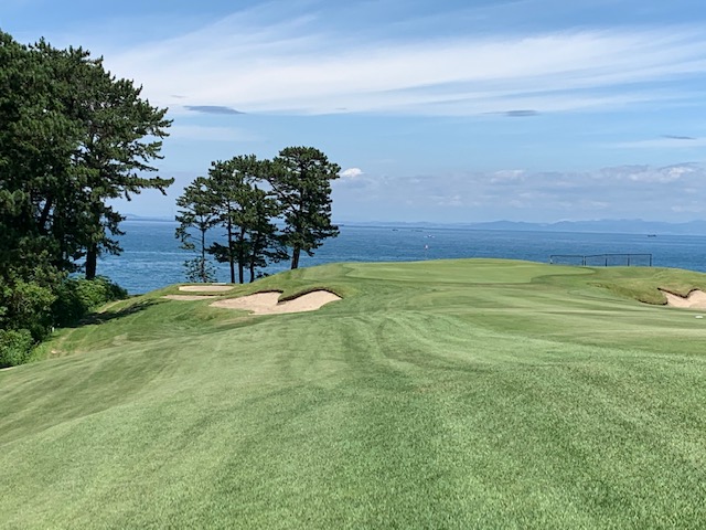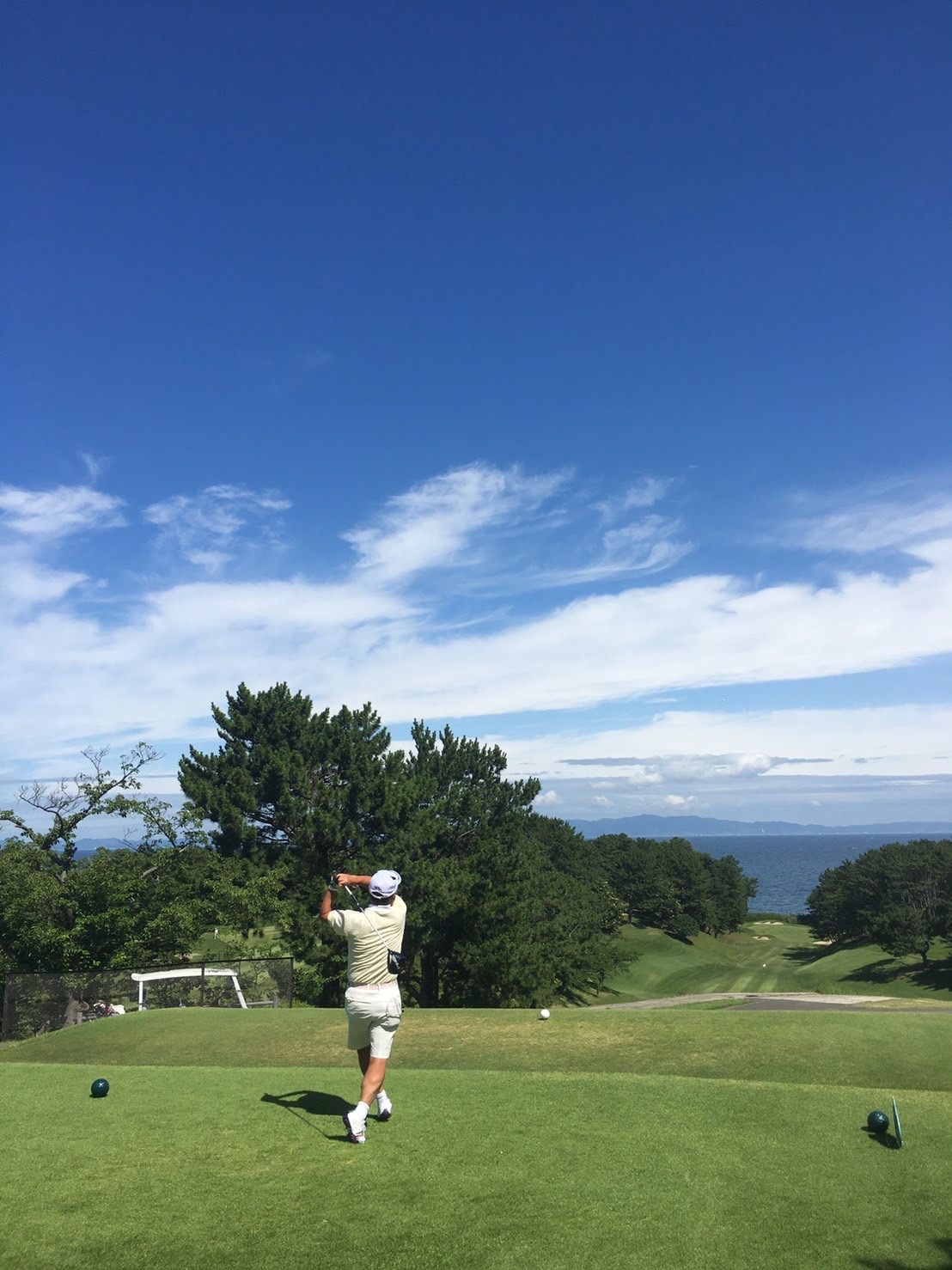 3番435yミドルは、ドライバーはまずまず。が、セカンドの7アイアンがど竜巻球。OB。アホか。打ち直しはショボ。7となる。見事なドライバー&アイアンでJ.Oさんがパー。フェアウェイは狭く、その先には海がドーンと見える豪快・狭いと感じるホールです。