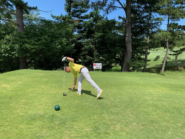 18番145yショートは、打ち上げなので7アイアンで1mに。しっかり沈めてナイスバーディ。オナーのJ.Oさん、最後の90センチを沈めてナイスパーで79ストローク!やりました~!