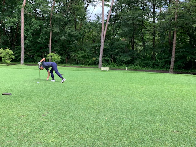 6番350yミドルは、ドライバーは左ラフへ。9アイアンでピン右6mに2オン。決められず。同じく2オンからK.Kさんも無難にパー。