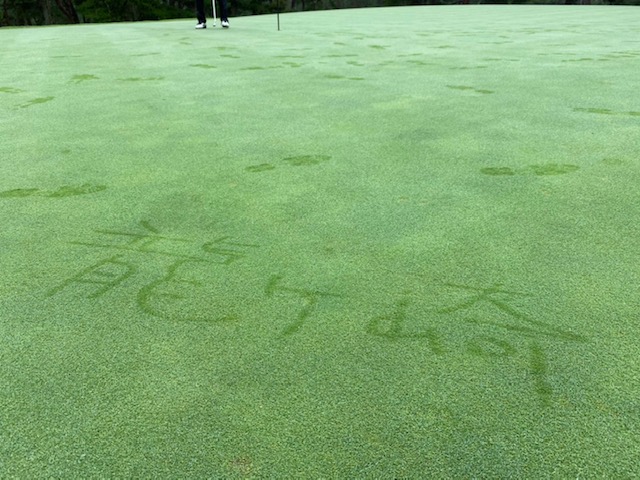 タケさんが雨で濡れていたグリーンに龍ヶ崎って書きました。おもろい方です。