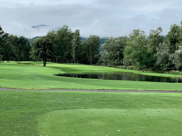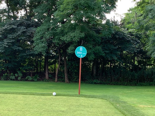 8番360yミドルは、ドライバーはナイス。アゲンストの中、5アイアンで打つも右への弱々しい球。お池にジャブン。ボールを失くさないと言っていたのに、、、。4オンのダボ。