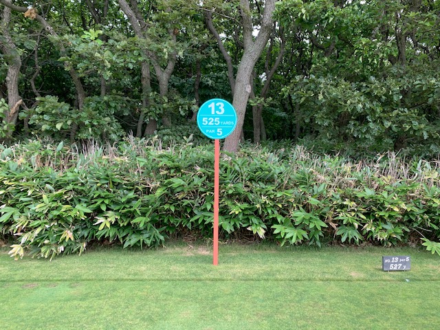 13番525yロングは、ドライバーはまずまず。3wで打つも左の林へ。チョン出し。PWで3mに4オン。沈めてナイスパー。