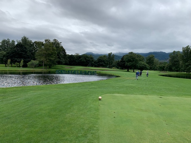 17番170yショートは、6アイアンで打つも左のカラー付近へ。3パンチのボギー。1オンからしっかり2パットのJ.Oさんが無難にパー。