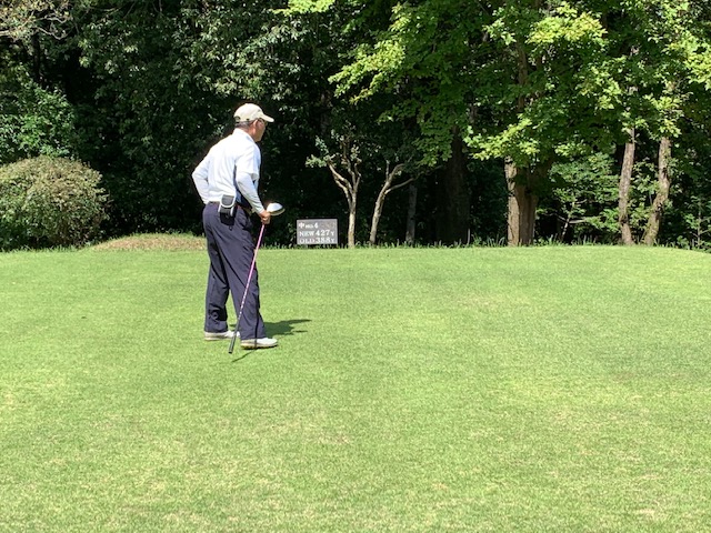 3番338yミドルは、ドライバーは左のフェアウェイバンカーを少々超える。残り80yから52度で打つもバンカーイン。なんとか1.7mに3オンしたが、入らず。ボギー。左カラーからパターでS.Tさんが放り込んでバーディ奪取。イイなー、みんな。社長も素晴らしいアプ&パターでパーゲット。