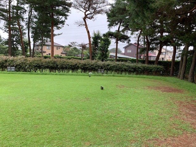 9番361yミドルは、ドライバーはヘナチョコ球でセンターの大木に当たる。3uで残り55yへ。で、ここからの56度がアホの大オーバーで左奥のバンカーイン。ホームラン。ダボ。素晴らしいティショットと3打目4打目でM.Mさんがナイスパー。1ダウンで敗戦となる。最後は結構降って来ました。