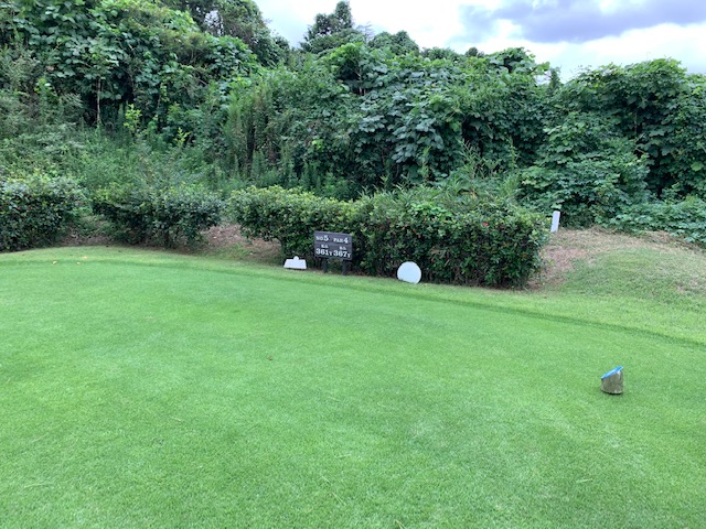 10番397yミドルは、ドライバーはまずまず。6アイアンで打つも右手前へ。寄らず入らず。