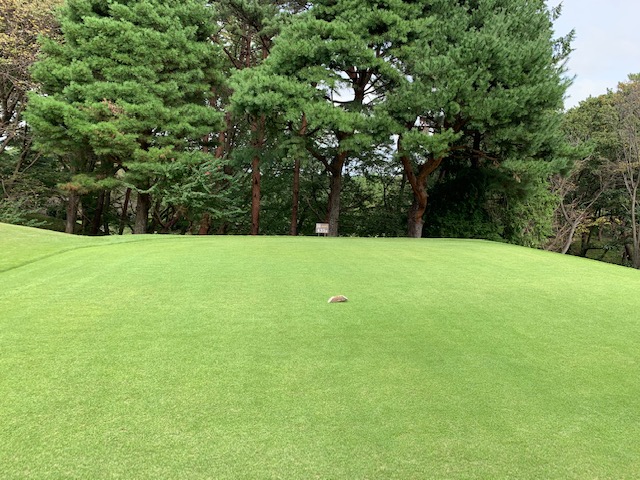8番389y上りのアウトの難関ホールは、ドライバーはナイス。3uで打つも左へ。なんとか2mに寄せたがパターが入らず。ショボパターである。