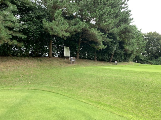 9番459yロングは、ドライバーは右へピュー。隣から8番で木越え。残り150yアゲンストを7アイアンで打つもバンカーイン。寄らず入らず。