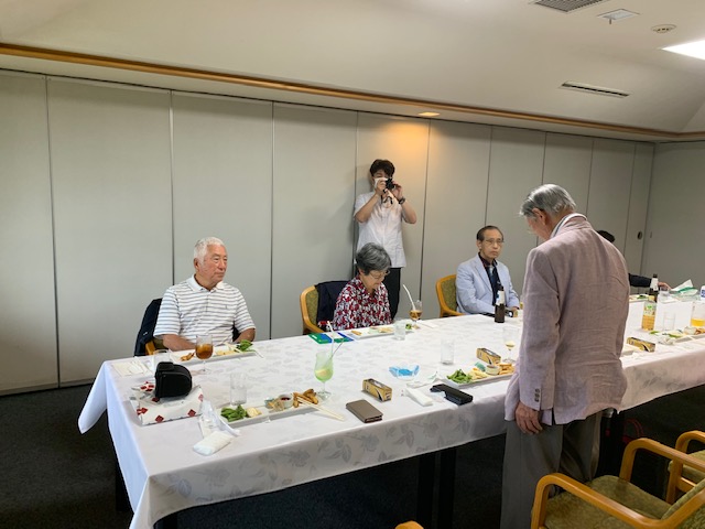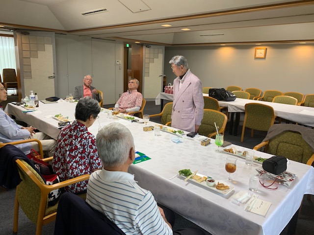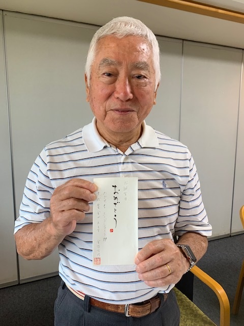 シャワータイム後、表彰式。今日の主役はもちろんH.Mさんですが、どうぞ、写真をよーくご覧ください。80歳に奥方様から頂いた誕生日祝いの御袋には、以下の言葉が書かれていたそうです。