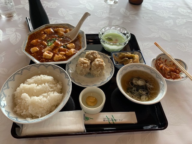 ランチは、麻婆豆腐定食1100円とシューマイ3個495円とキムチ165円をいただく。ナイスナイス!ゴルフ場で食事がイイとそれだけでご機嫌だね~。今の私の楽しみは食でございます。前の組の縁の会員さんH.Mさんが39回だそう。43ならエージシュートだ!頼みます!!