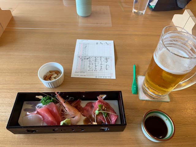 ランチは、オードブル(刺身とローストビーフ)が付くというので生中をいただくことに。それとカキフライを食す。まずまず。