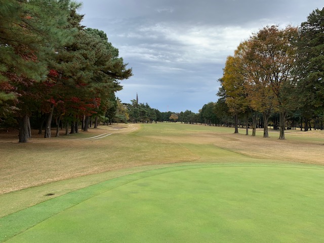 17番336yミドルは、ドライバーは竜巻球も木に当たり左ラフへ出てきた。ラッキー。9アイアンでピン手前9mに2オン。無難にパー。