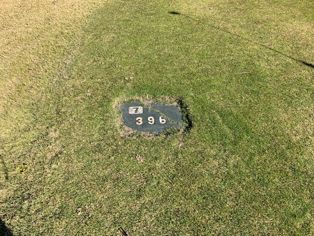 7番396y右ドッグのミドルは、ドライバーは右ラフへ。8アイアンでレイアップ。寄らず入らず。
