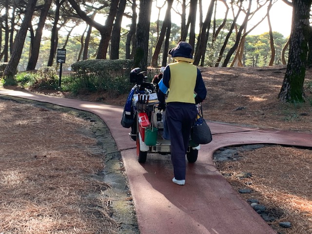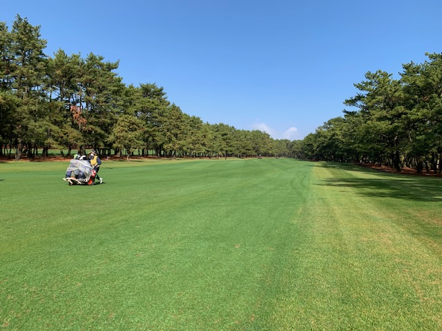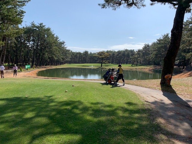 1番391yミドルは、ドライバーは右ラフへ。4アイアンで打つもバンカーイン。寄らず入らず。宮崎シリーズ初めてバンカーインしました。レーキを触るとキャディのSさんがシュッっと消毒液をスプレーしてくれました。
