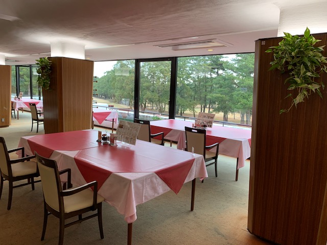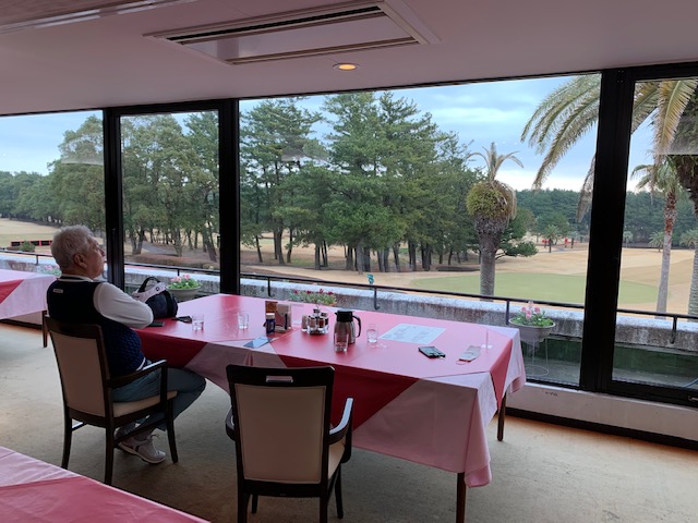 到着し、レストランで木挽ブルーを一合、お湯割にしていただきます。で、インから。今日もバックティで進行します。6,585yしかないんですが、グリーンが超難しいそうです。宮カンは全てのホールに木の名前が付けられています。短いからとアンちゃんは同じティから打つそうです。
