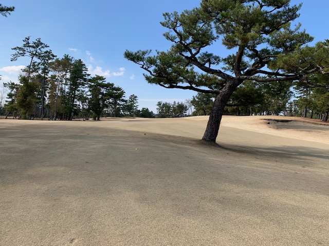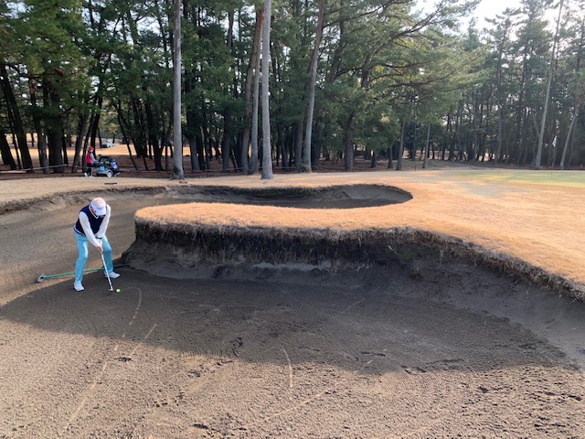 14番383yミドル(ツバキ)は、ドライバーはナイス。初めてフェアウェイへ行った。7アイアンで打つもバンカーイン。乗らず。やっとのボギー。