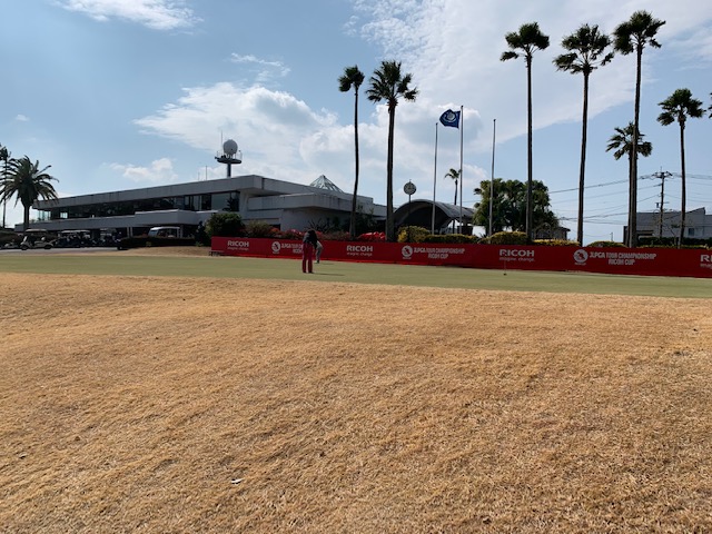 18番423y左ドッグのミドル(フェニックス)は、ドライバーは大きく右へ。4アイアンで打つも左へ。まだ距離が135y上りが残る。7アイアンで打つも右へ。寄らず入らずダボ。こんな難しいホールを女子プロは。。。。凄い。。。。