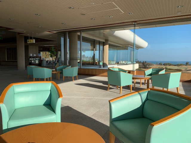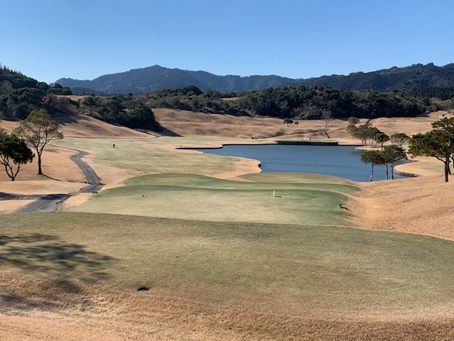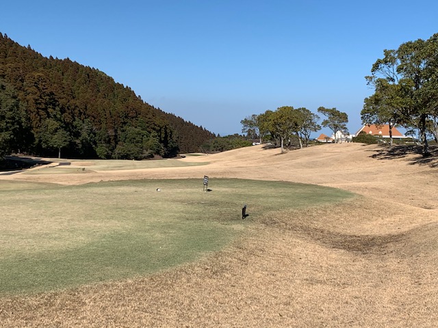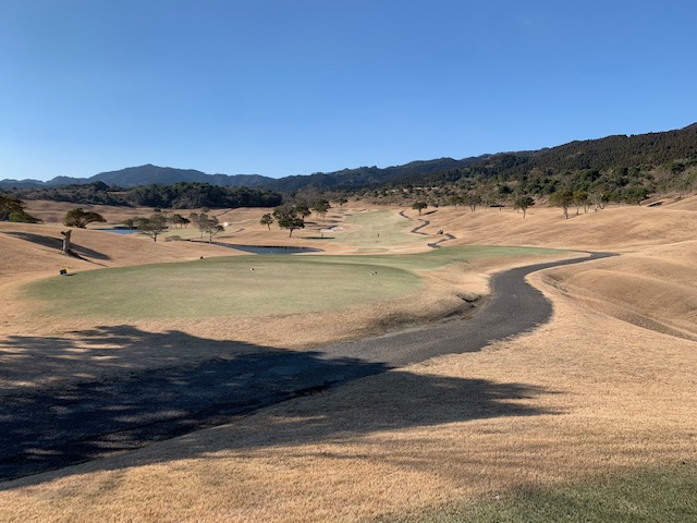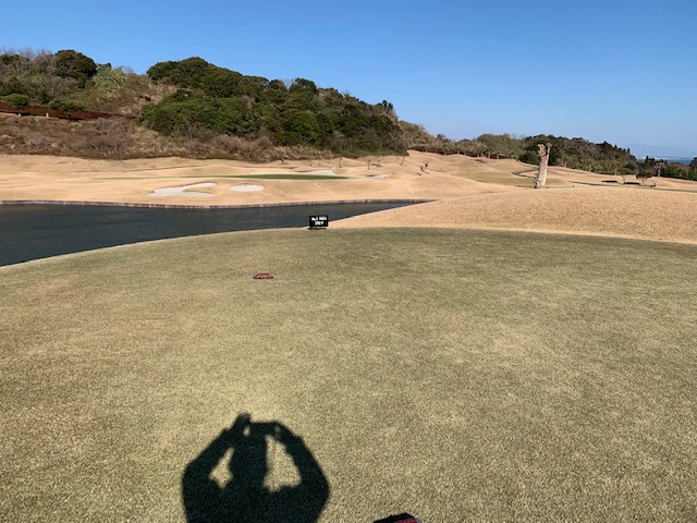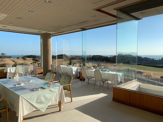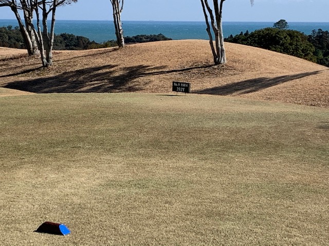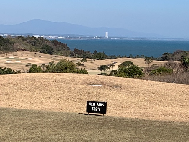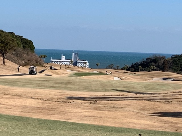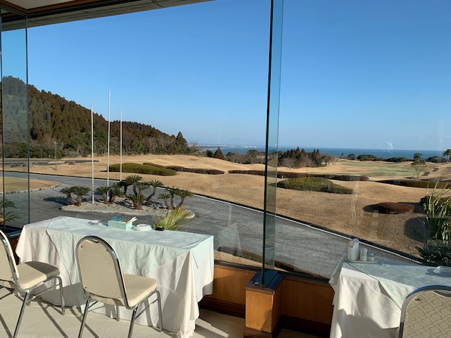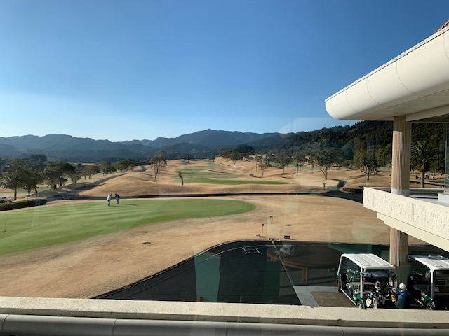 で、いつものようにレストランに行こうとしたら、昼しかやっていないそう。あらま。仕方なく眺めが良い2階の席で写真撮影の後、パターを転がす。宮崎シリーズで初めてパター練習をしました(笑)。しかし、素晴らしいビューであります。しかし、凄い強風で、しかも寒い。