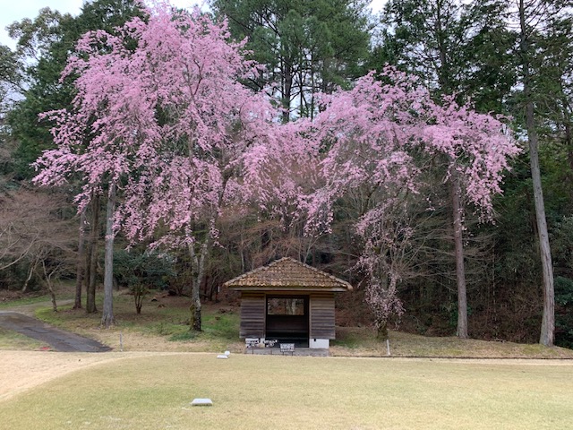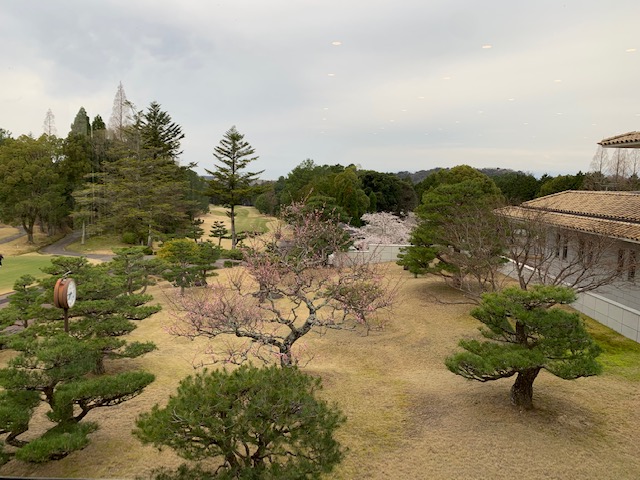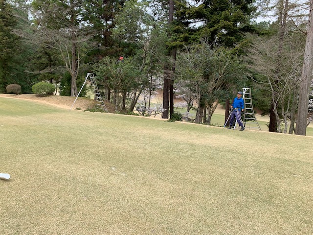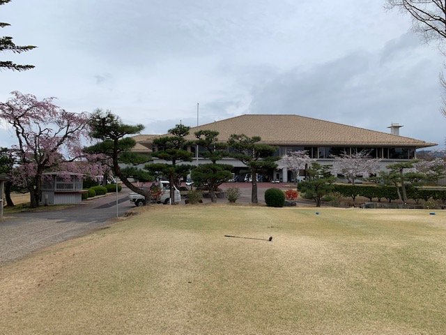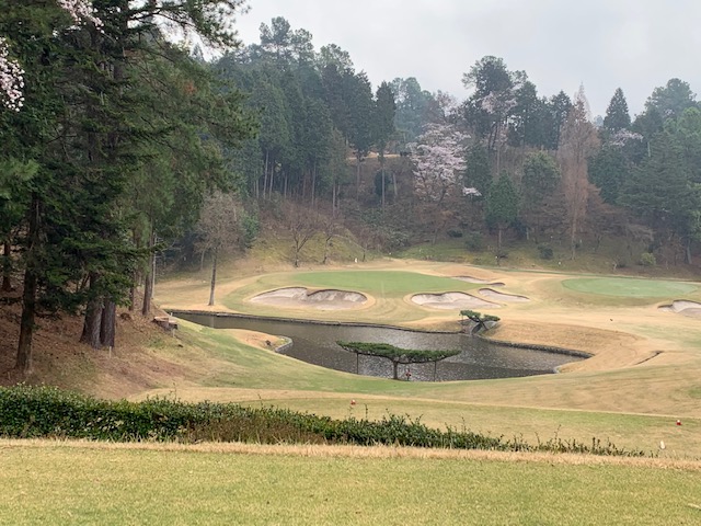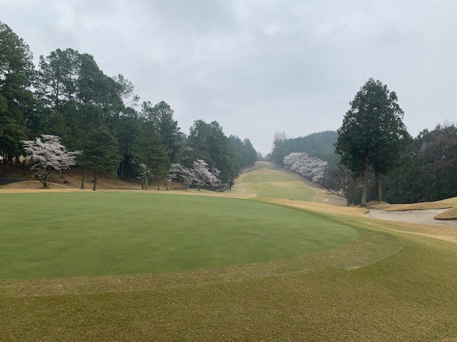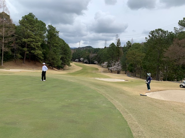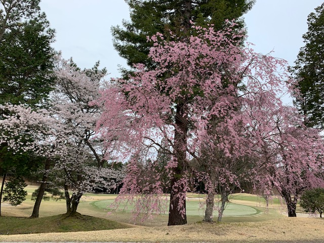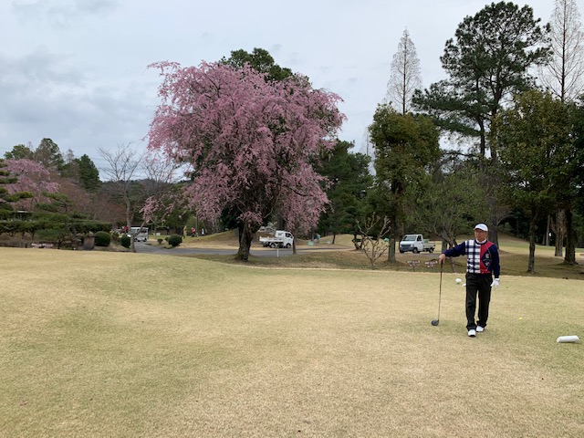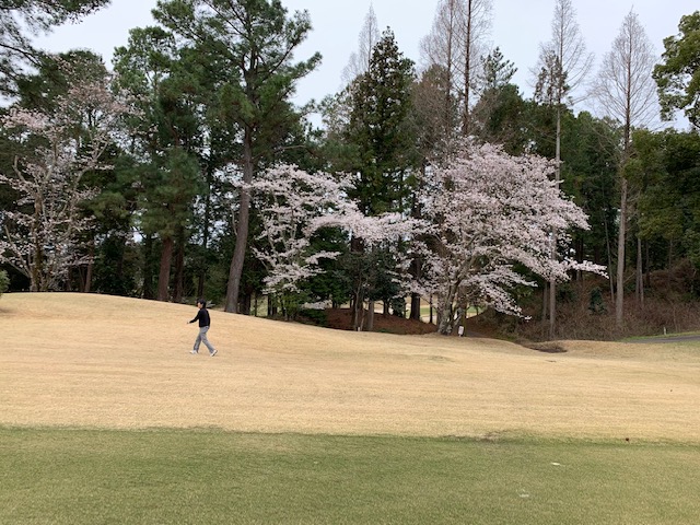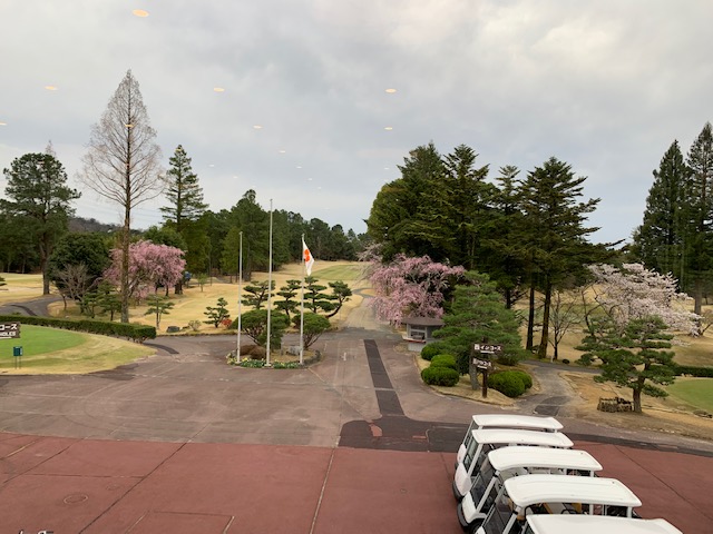 まずは、到着し、レストランで黄金水と和朝食を頂きます。鮭が小さい。今日も十二分に歓談後、少々パターを転がしてアウトから。今日も白ティ6,670yで進行します。桜が見事です。