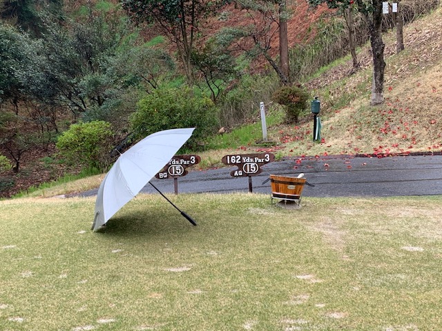 インへ。今度のキャディさんはSさんです。うわ、雨が降って来ました。で、合羽を着ます。