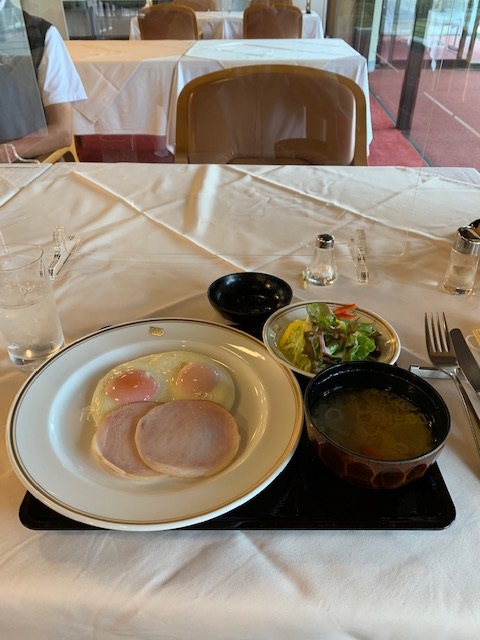 まずは、着替えて、レストランへ。7時半からだそう。で、朝はアルコール類はないそうな。昼からだそうです。グアムのようですね。ハムエッグとさつま汁を食します。安くて美味しい。