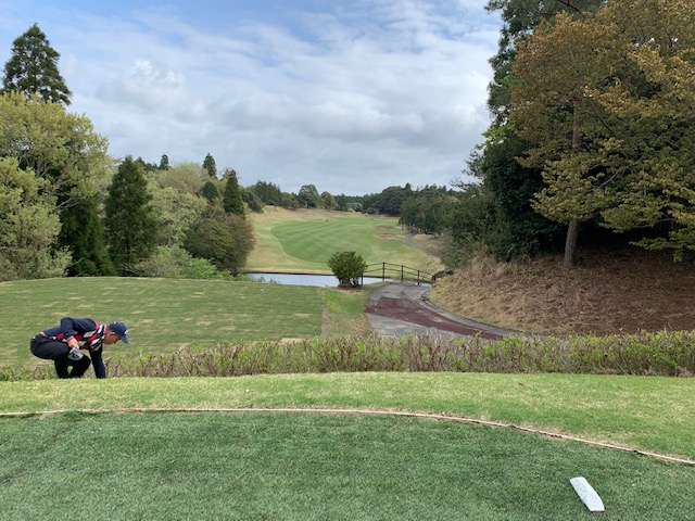 9番471yロングは、ドライバーは竜巻球でお池にジャブン。ドロップして3打目を3wで打つもライが悪くチョロ。4打目を7アイアンで完璧。が、2パットで6となる。