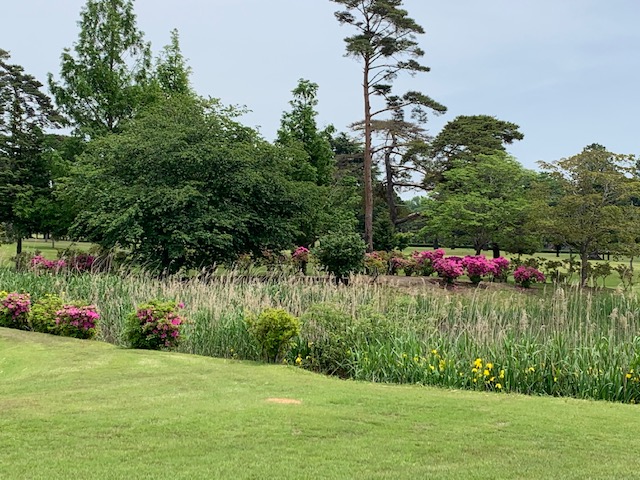 14番355yミドルは、ドライバーは左の木の裏。8アイアンで真横へ。残り155yから木越えを25度でのスライスで打つと、なんと3mに3オン。これがまた入ってナイスパー。
