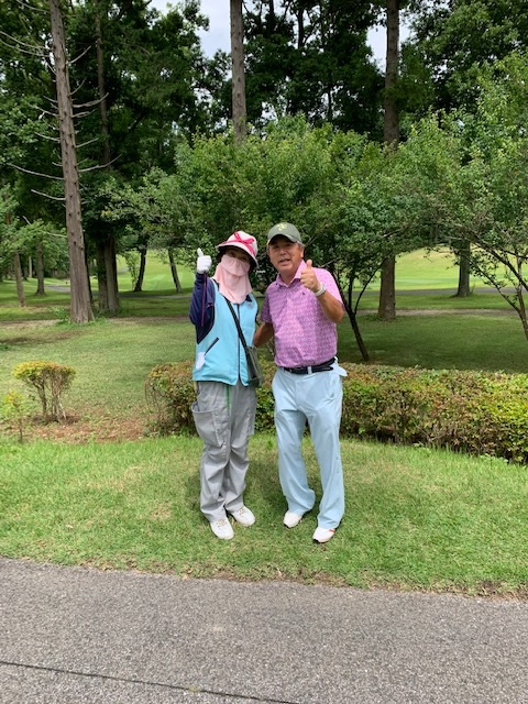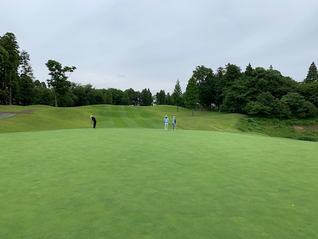 時間になりました。パターを転がして、インから。四街道市のW.Iさん、流山市のM.Yさん、船橋市のS.Oさんとの組み合わせです。インから。シニアは青ティ使用です。