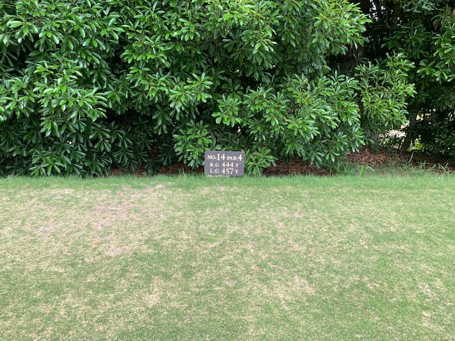 13番200yショートは、25度のuで打つも超竜巻球で前の組のほうへ飛ぶ殺人球となる。でっかいファーの声を上げる。ややこしい位置からチョロ。3打目がバンカーイン。ここから4mに。これが入りナイスダボ。