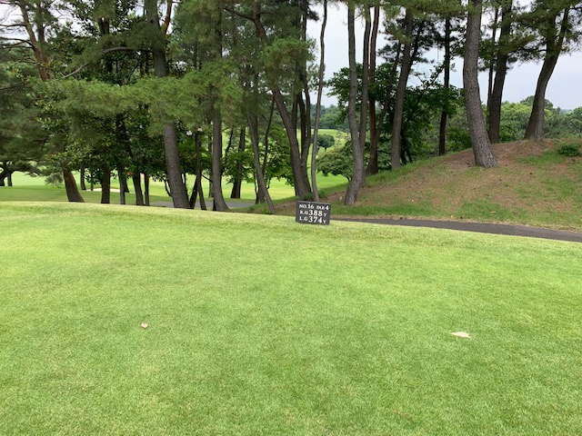 16番388yプロは1オンを狙うミドルは、ドライバーで打つも左ラフへ。距離の違いを痛感します。52度で打つも奥のバンカーイン。寄らず入らず。