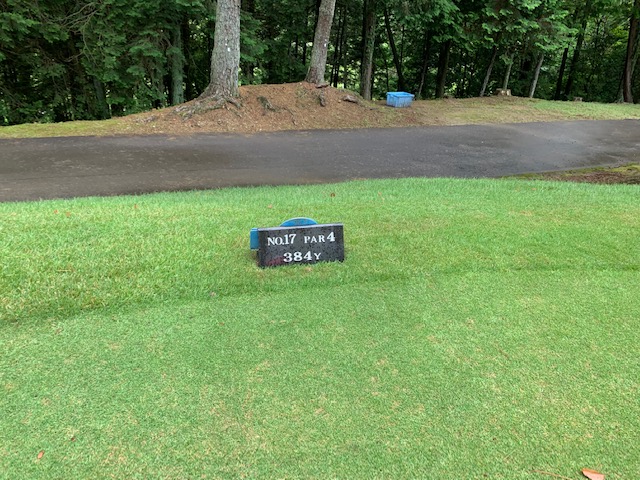 17番384yミドルは、ドライバーは左ラフへ。8アイアンで木越えを敢行。が、右に飛ぶ。4mにしか寄らない。根性で入れに行くも残念ボギー。