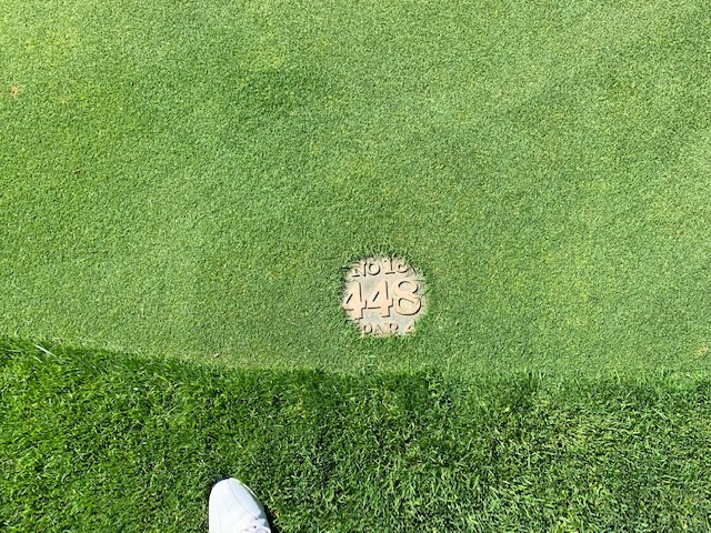 16番552yロングは、ドライバーは右へ。3wで根性で池先の左の林入口へ。6アイアンで花道へ。56度で3mに4オン。残念ながら入らず。N.Tさんが3オンから無難にパー。ついにイーブンに。追いつかれた。。。