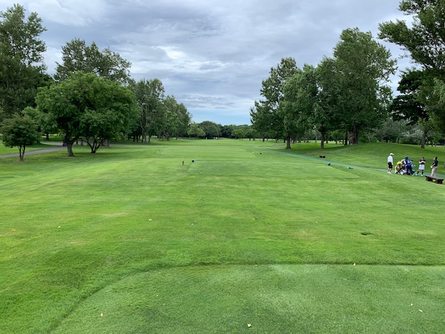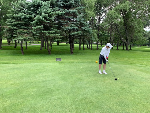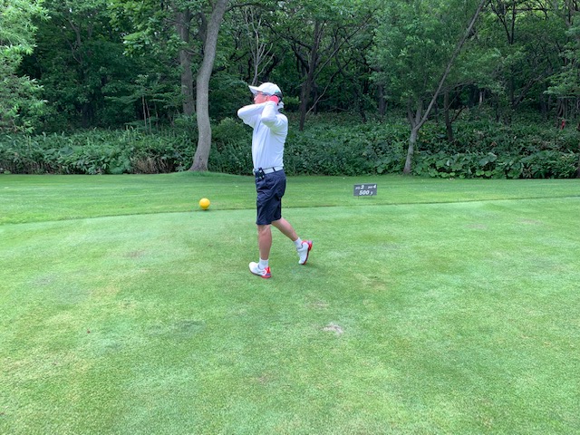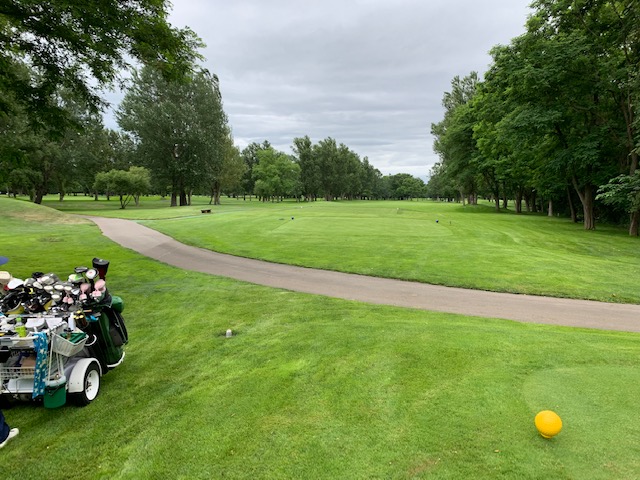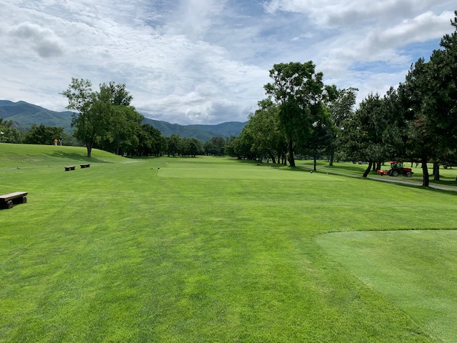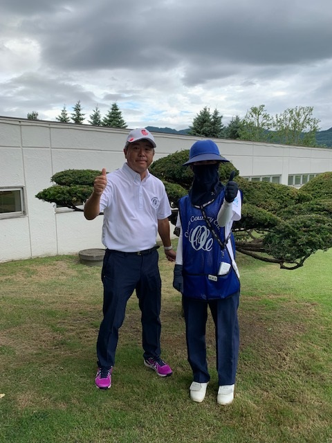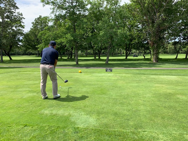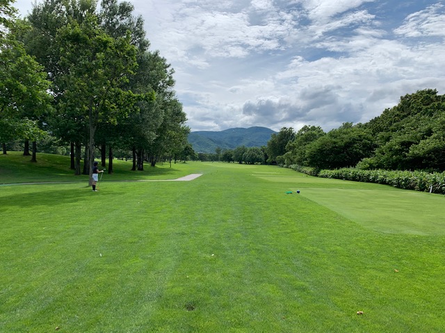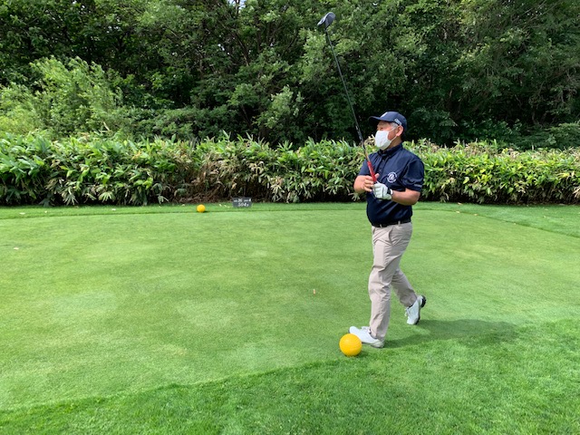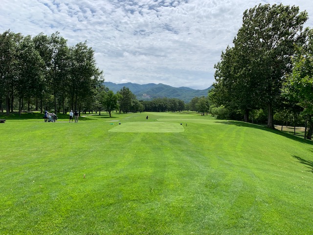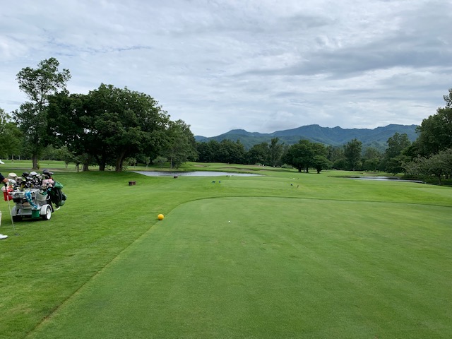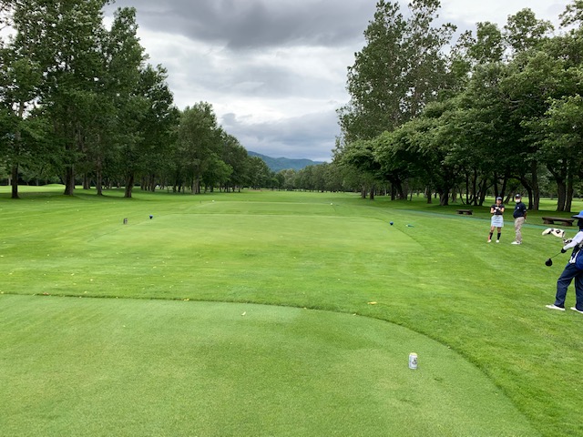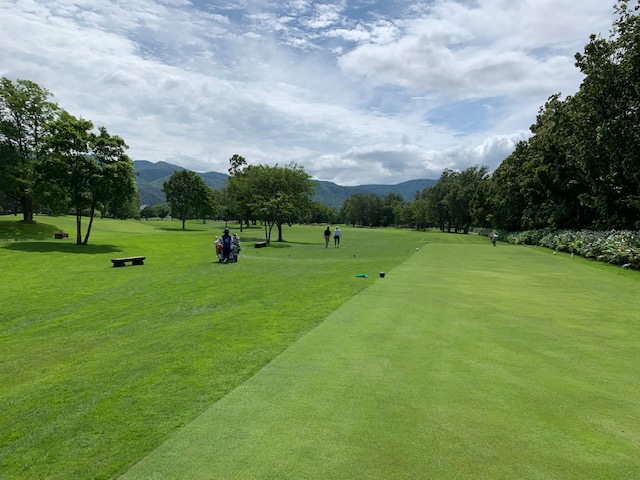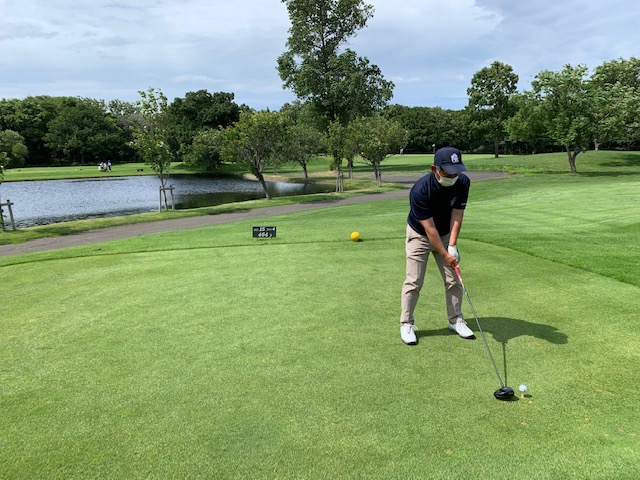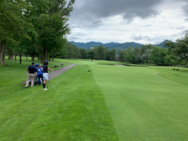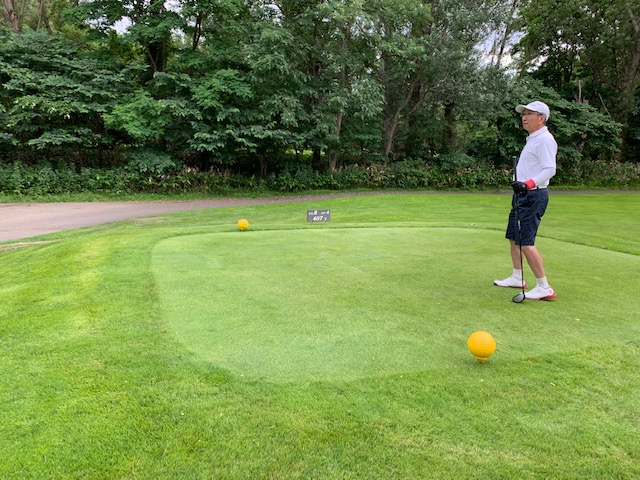 インから。今日は明日のクラチャン予選に出場のH.Kさんと前出のK.Tさんと縁の神奈川県のR.Sさんとのラウンドです。黄色のチャンピオン7,427yから。