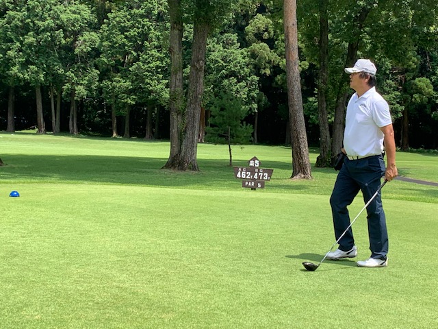3番476yロングは、ドライバーは今度は左へ。PWでカチ上げるも木に当たる。残り185yから6アイアンで木越えを狙うもかすってしまう。残り90yから56度で1mに。沈めてナイスパー。同じくナイスアプからH.Tさんもパー奪取。