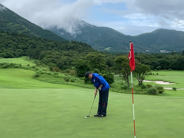 18番427yミドルは、ドライバーは酷い球。8アイアンで斜め前方へ。PWで1mに。沈めてナイスパー。見事な2オンからS.Kさんが無難にパー。