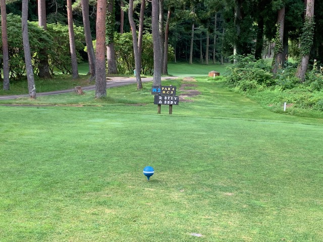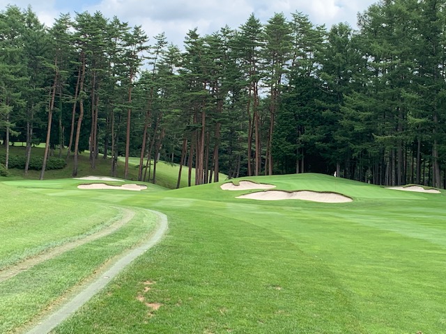 2番359y左ドッグのミドルは、ドライバーは左のクロスバンカーイン。8アイアンで打つもバンカーイン。まずまずでしたが、パターが決まらず。同じバンカーから1mに3オンのオッチャンがナイスパー。同じくナイスパットでA.Fさんもパー。