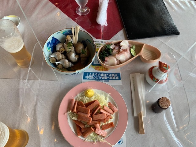 ランチは、生ビールにタコブツ、ウインナー炒め、バイ貝をいただく。なかなかグー。