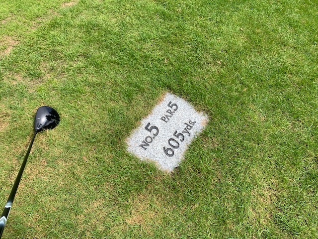 5番605yロングは、ドライバーは竜巻球で左ラフへ。25度のuで残り180yへ。3打目も25度のuで奥のラフへ。寄らず入らず。
