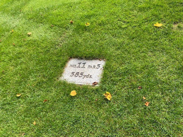 11番585yロングは、ドライバーは右ラフへ。6アイアンで斜め前方へ。3w、56度で1mに4オン。なんとかパー。