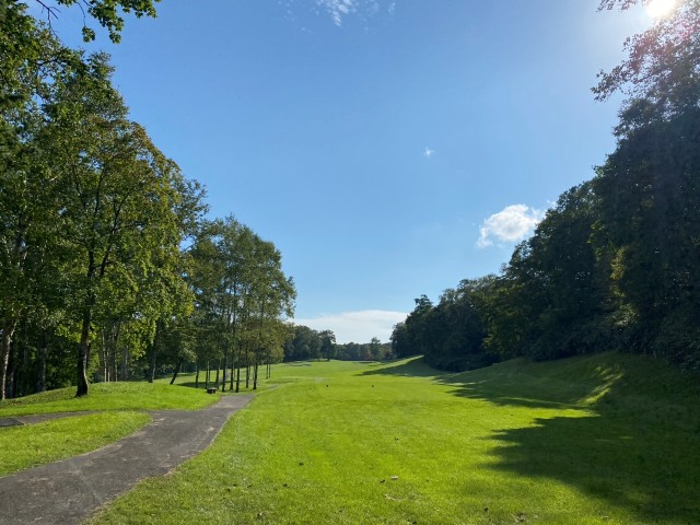 11番585yロングは、ドライバーは右ラフへ。6アイアンで斜め前方へ。3uで花道付近へ。が、ここから寄せられない。ボギー。
