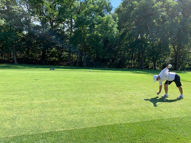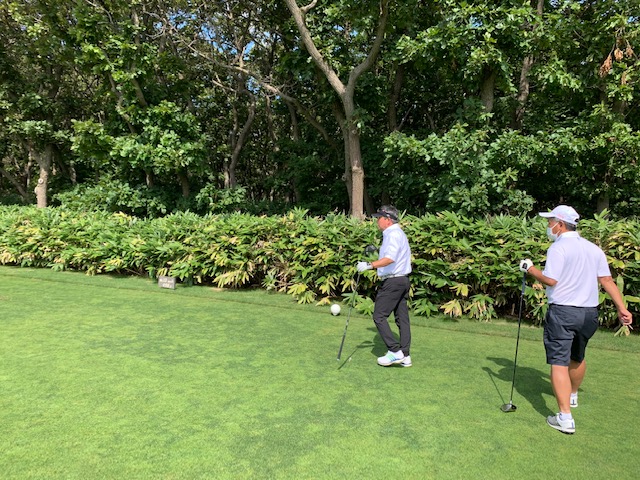 6番535yロングは、ドライバーは左ラフへ。5アイアンで残り120yへ。PWで打って傾斜で戻し、2mに。沈めてナイスバーディ。同じく素晴らしい3打目で4mに3オンのA.Mさんもバーディ奪取!奥に3オンのY.Uさんが無難にパー。1アップ。