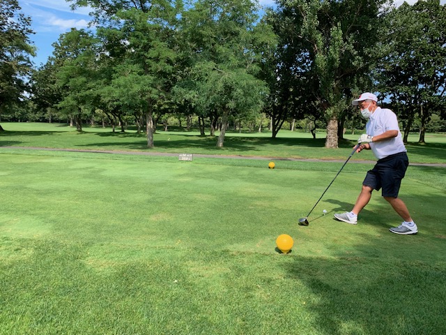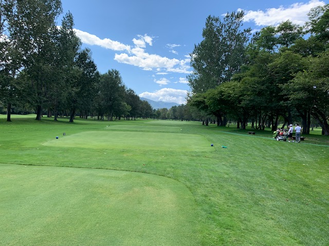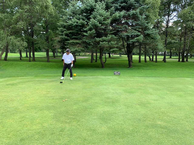 パターを少々転がして、インから。昨日は13.6フィートだったそうですが、今日は12.7フィートだそうです。今日は前出のH.Kさんと縁の東京都の会員さんY.Uさん、そして、お二人のお友達の会員さんA.Mさんとのプレーです。7倶楽部の会員でもありここ小樽ではハンディ4のY.Uさんにマッチで勝負を挑みます。