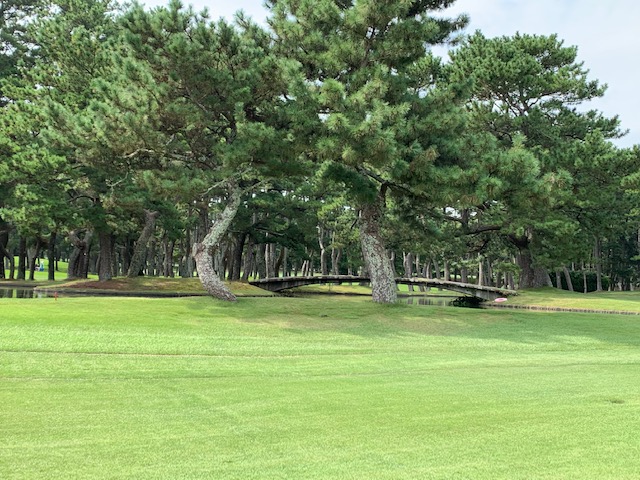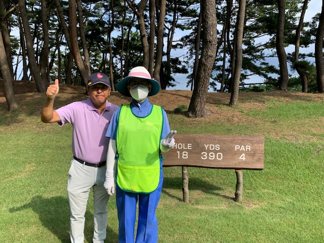 18番390yミドルは、ドライバーは左のクロスバンカーイン。8アイアンで打つも土手に当たる。PWでの3打目が右へ。寄らず入らず。素晴らしいパターでのアプが入りK.Kさんがチップインパー。