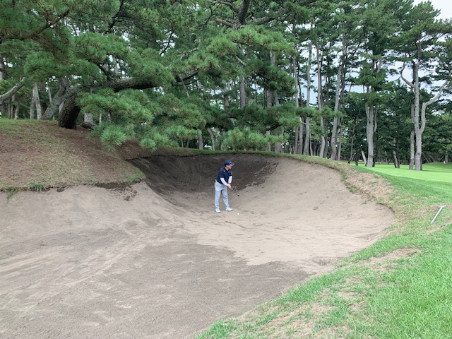 14番170yショートは、5アイアンで打つもバンカートラフのはざまの縁に。腰を曲げて52度での左打ちをしたが、バンカー内に転がる。56度で3オン。これも沈めてナイスボギー。見事な1オンからYさんが無難にパー。