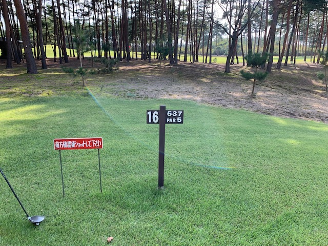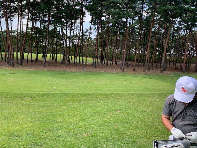 7番474yロングは、ドライバーは竜巻球で林入口へ。5アイアンで狭い空間を射抜こうとしたが、カーン。3打目もカーン。4打目でアウト。52度で5オン。ダボ。