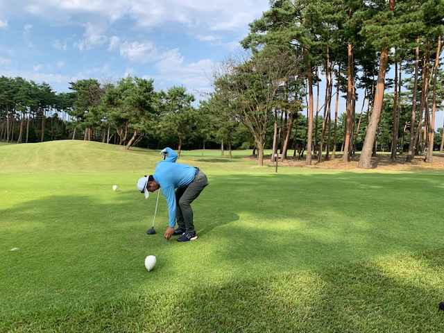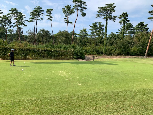 まずは、2階レストランへ行き、東京都のT.Kさんと二人ミーティングです。その後、パターを転がして、アウトから。白ティから進行します。