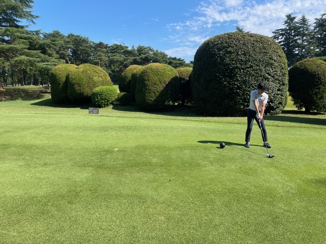 1番419yミドルは、ドライバーはナイス。4アイアンで打つも手前のカラーへ。パターで打つもオーバー。返しを外してボギー。見事なアプからK.Tさんがパー奪取。アウトも素晴らしい出だし。