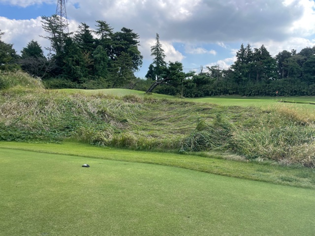 6番337yミドルは、ドライバーは右へ。この時会員のA.Fさんから「今日の位置は超むずい位置です」とのお言葉が。残り150y上りを25度のuで打つもデカい。ややこしい位置からチョロ。上手く打った4打目がえー!?っとオーバー。こういうことか。5オンの7となる。