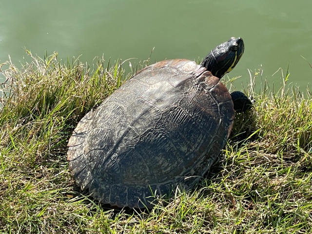 16番353yミドルは、ニュースイングは左に行かない!と池からフェードで打つも池淵へ。赤線の中から必死に8アイアンで左のカラーへ。パターで転がすも寄らず入らず3パンチボギー。